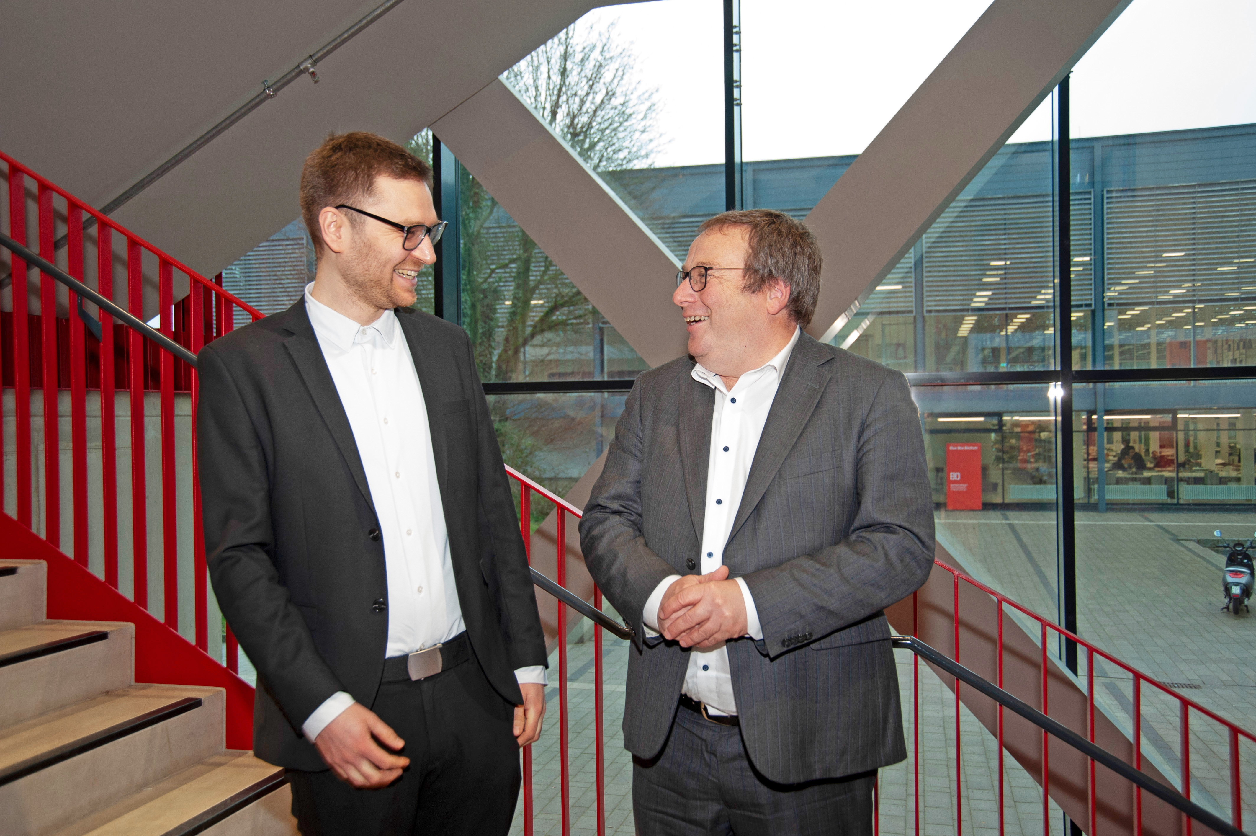 NRW-Verkehrsminister Oliver Krischer war jetzt zu Besuch an der Hochschule Bochum. Er nutzte die Gelegenheit, den ersten "Landes-Fahrrad-Professor", Dr. David Kohlrautz, persönlich kennenzulernen. Denn für die vom Land NRW gestiftete Professur mit dem Studieninhalt Radverkehr wurde im vergangenen Jahr ein geeigneter Kandidat ausgewählt und auch berufen.