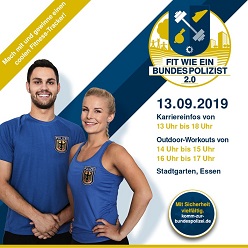 Im Rahmen der Nachwuchskampagne "Mit Sicherheit vielfältig", führt die Bundespolizei nach dem Erfolg der letzten zwei Jahre von "Fit wie ein Bundespolizist" neue Live-Workouts in vier verschiedenen deutschen Großstädten durch. Eine dieser Städte wird am kommenden Freitag (13. September) Essen sein. Die Workouts finden dieses Mal jedoch nicht in Fitness-Studios, sondern im Freien, im Essener Stadtgarten, statt.